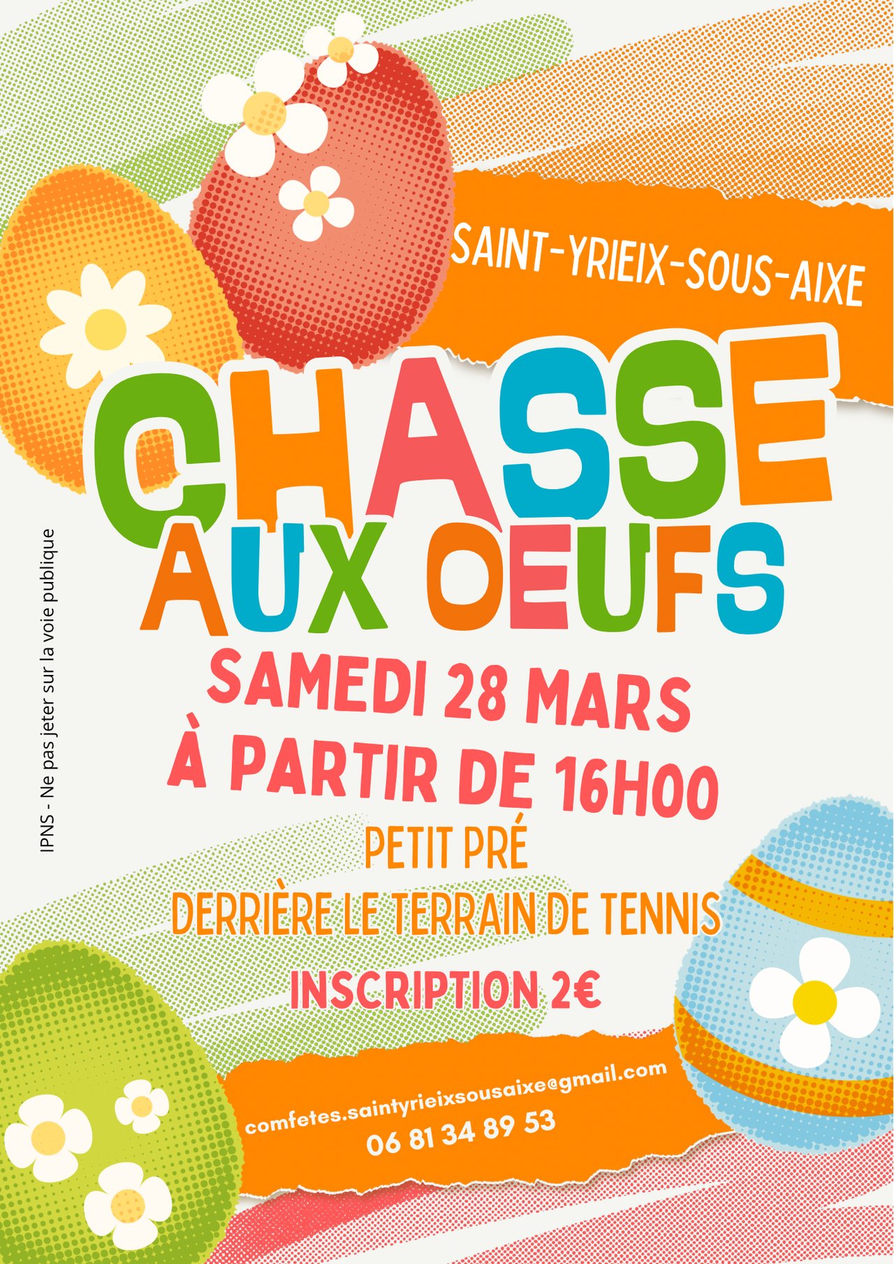 Venez chercher les œufs cachés dans le petit pré derrière le terrain de tennis. (voir ci dessous)
